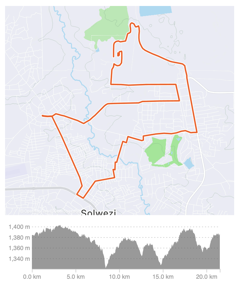 Starting at Trident College, the 21km exits North through the back gate, entering Kansanshi Mine. Runners continue down the Kansanshi Mine Road until they get to Kansanshi Golf Estate. They cross the Solwezi river and turn around near Shoprite on the T5. They then loop around the Solwezi Secondary School pillar, re-cross the Solwezi River, and make their way back to Trident College for the finish.