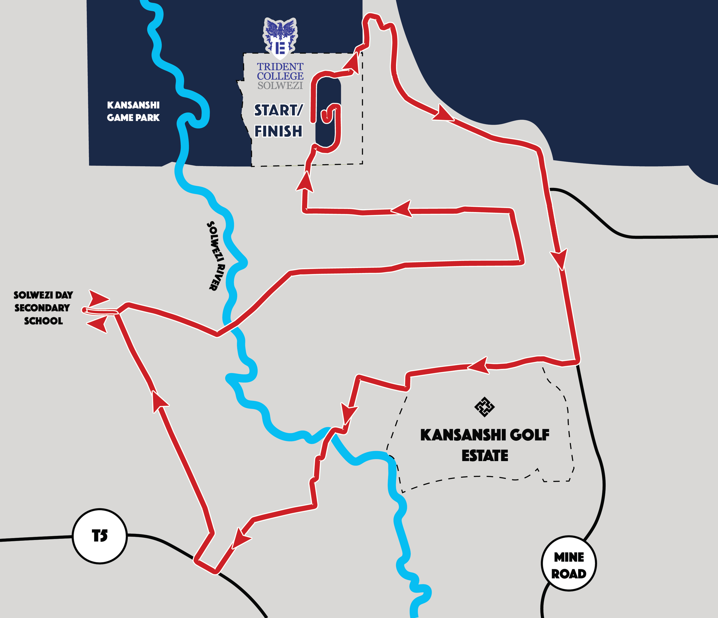 Starting at Trident College, the 10km exits North through the back gate, entering Kansanshi Mine. Runners continue down the Kansanshi Mine Road until they get to Kansanshi Golf Estate. They cross the Solwezi river and turn around near Shoprite on the T5. They then loop around the Solwezi Secondary School pillar, re-cross the Solwezi River, and make their way back to Trident College for the finish. They will complete this route twice.